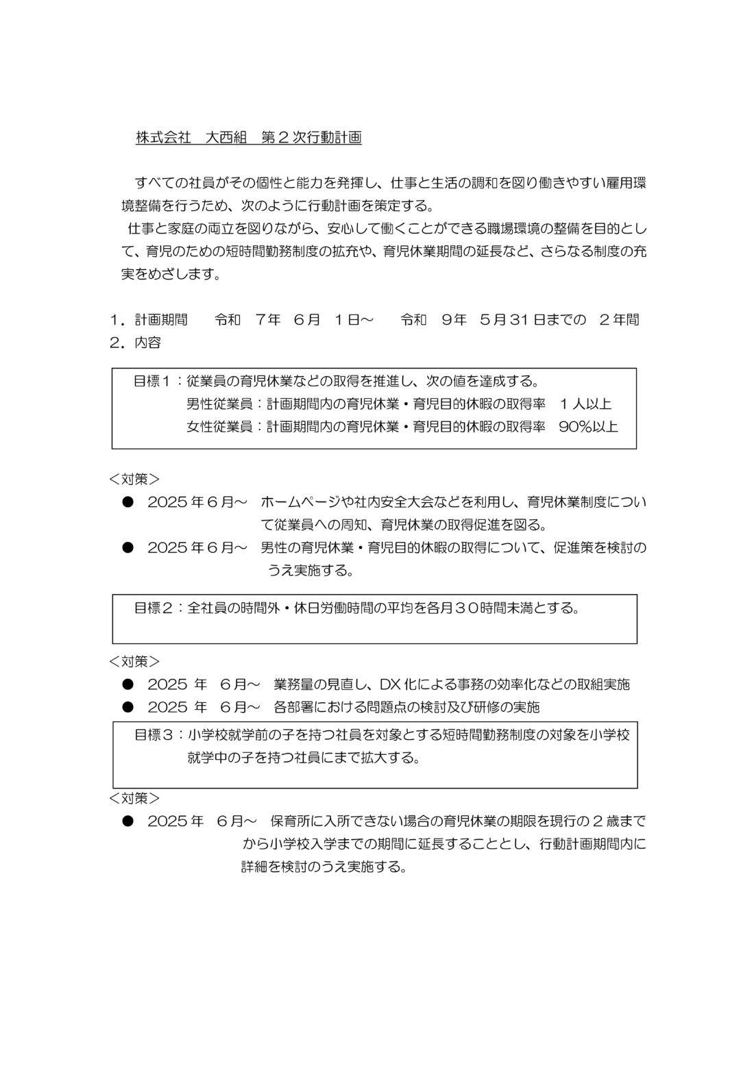 令和7年6月1日 ㈱大西組は「仕事と家庭の両立を図りながら、安心して働くことができる職場環境の整備を目的とした行動計画」を策定。