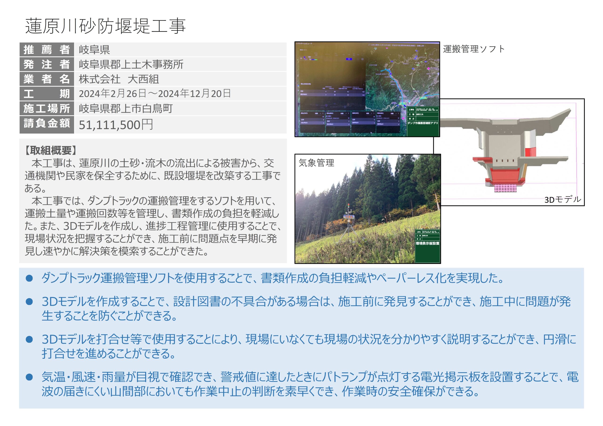 建設業を通して地域の方々が安全・安心で快適に暮らすことができる社会を目標に、地域のインフラ整備を進めてまいりました。 大西では5S(整理・整頓・清潔・親切・躾)を第一に掲げ、社員一人ひとりが地域社会に貢献できる企業目指し、広範多岐にわたり、道路や橋梁・トンネル工事を始め、河川・砂防・治山・林道及び水道・下水道など弊社はあらゆる分野において幅広く携わっています。